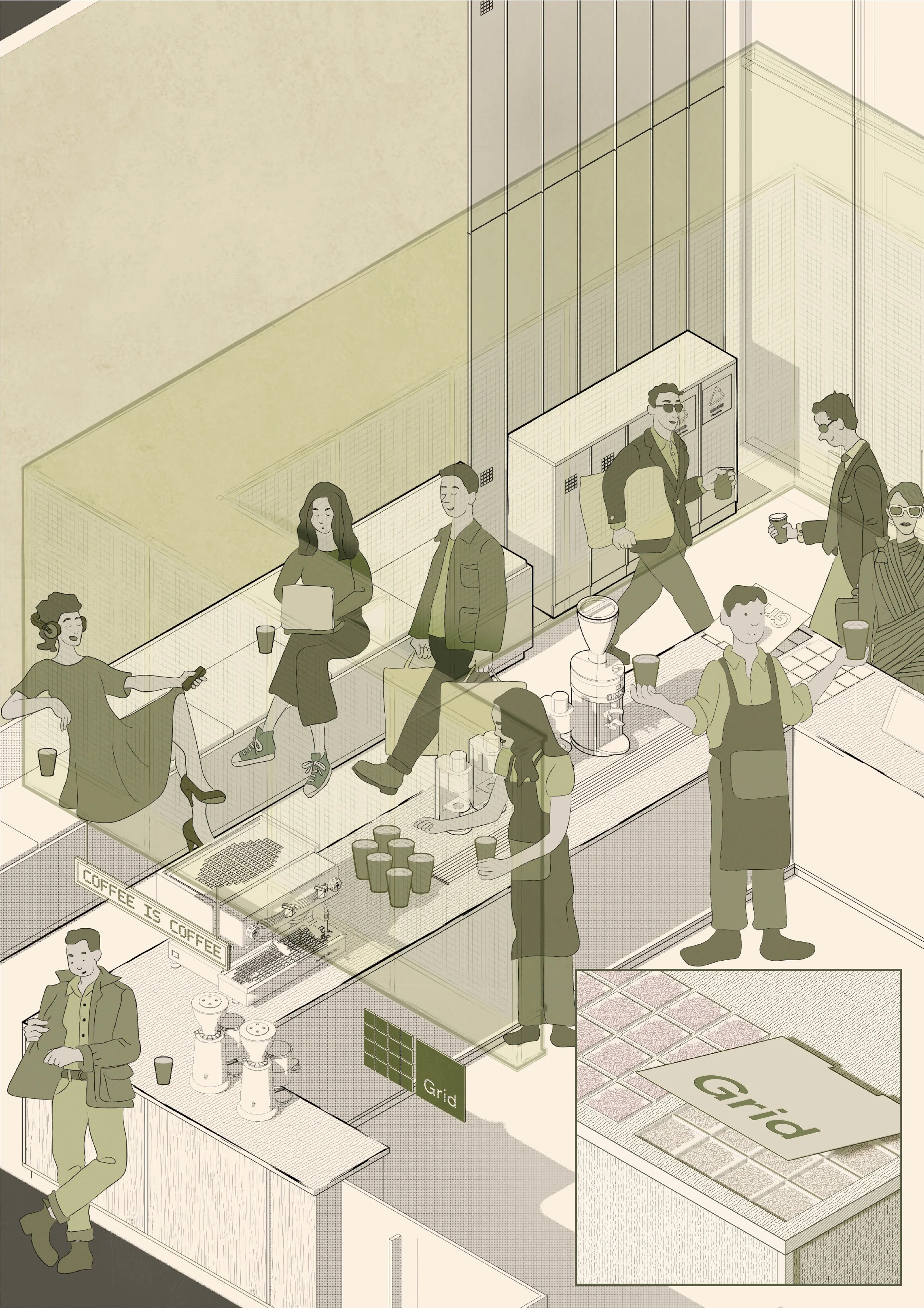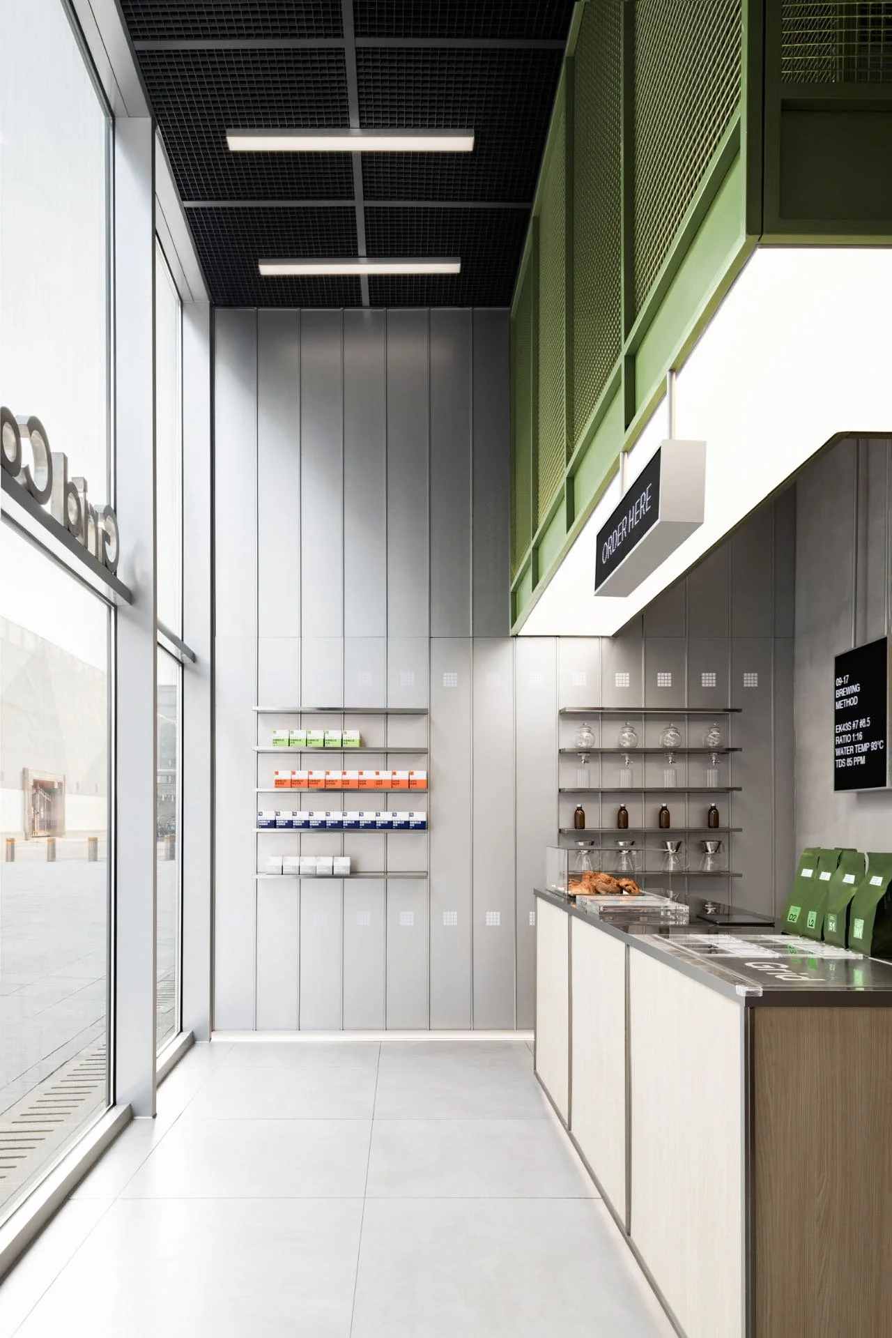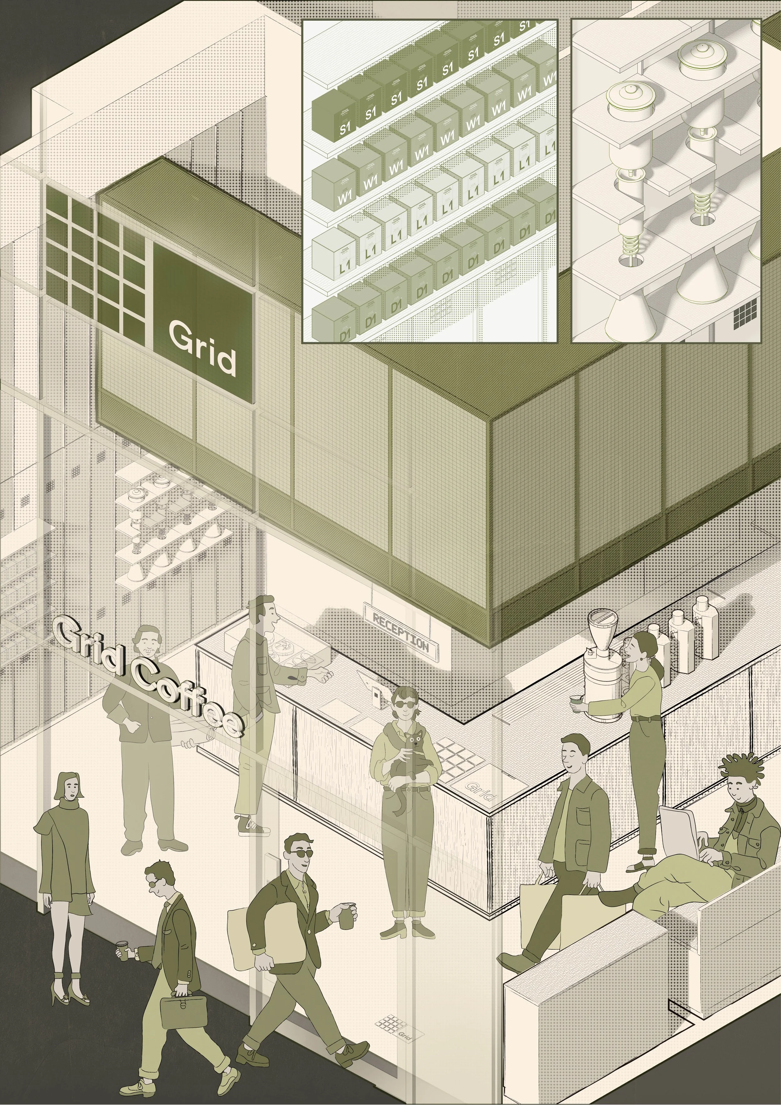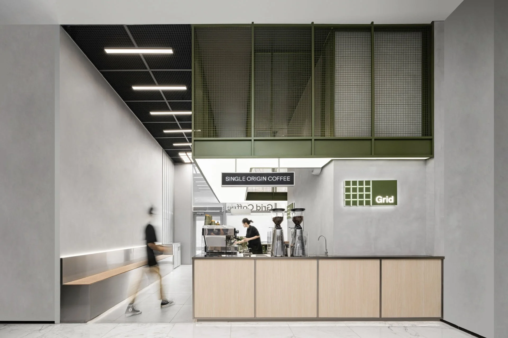 Interior Design for Grid Coffee, an emerging coffee brand hailing from Beijing. This design concept seamlessly integrates the elegant simplicity and structured order of grids, transforming the space into a serene and futuristic environment, perfectly suited for unwinding and savoring moments of relaxation and delight.