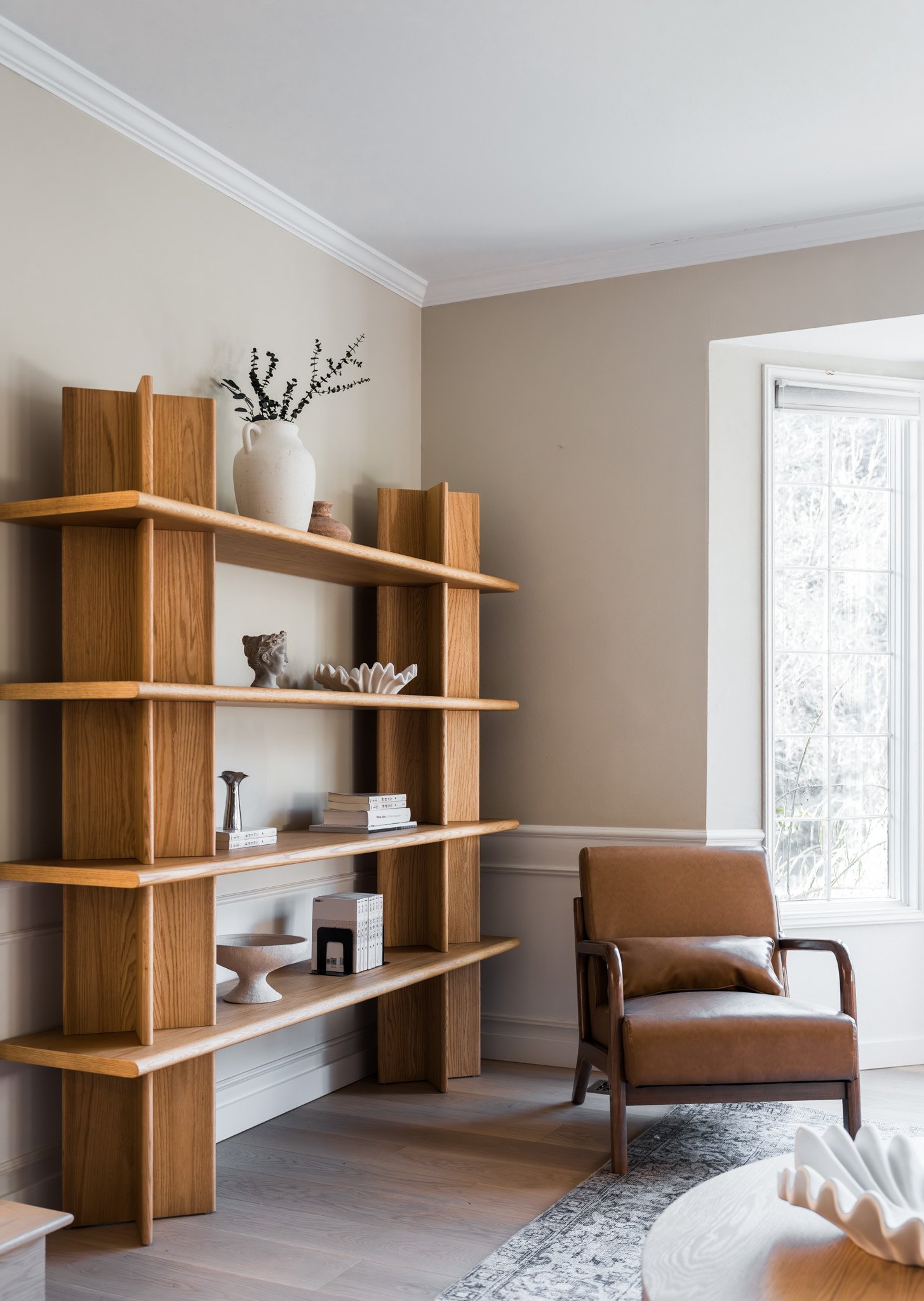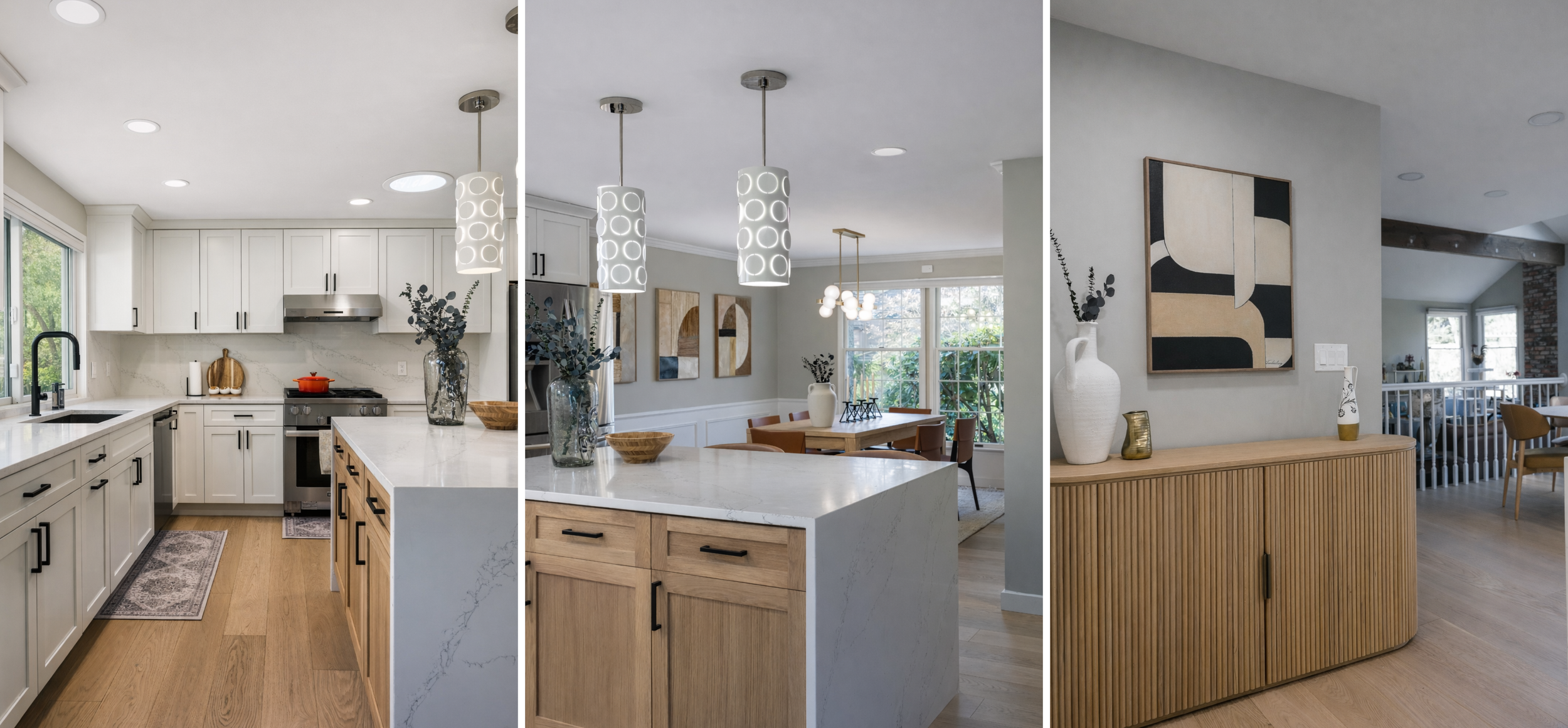 This interior renovation transforms a dated late-80s American farmhouse into a clean, modern living space. The design strips away heavy textures and traditional trims in favor of a brighter, more streamlined aesthetic. Natural wood tones, minimalist cabinetry, and soft white finishes come together to create a warm yet contemporary atmosphere—bringing a fresh sense of openness and elegance to the heart of the home.